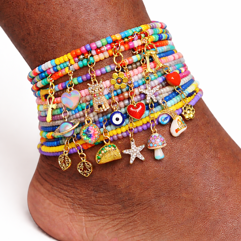 Discover a fun mix of style and meaning with this 10pc Anklet with Charms Grab Bag. Each anklet is handmade with vibrant beads and finished with a charm accent that adds personality and flair. Made with stretch cord for a comfortable and flexible fit.