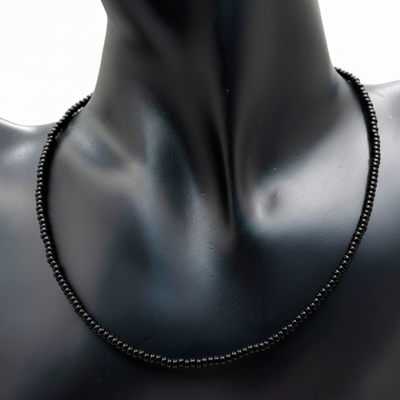 Simple and versatile, this black beaded necklace is perfect for everyday wear or layering with your favorite pieces. Its clean look and lightweight feel make it a timeless accessory for any style.