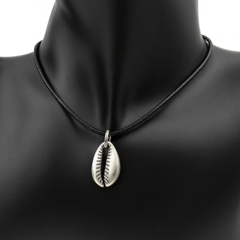 This black cord necklace with cowrie shell features a natural cowrie shell centerpiece on a sleek black cord. The contrast between the smooth cord and the shell detail creates a simple yet eye-catching look.