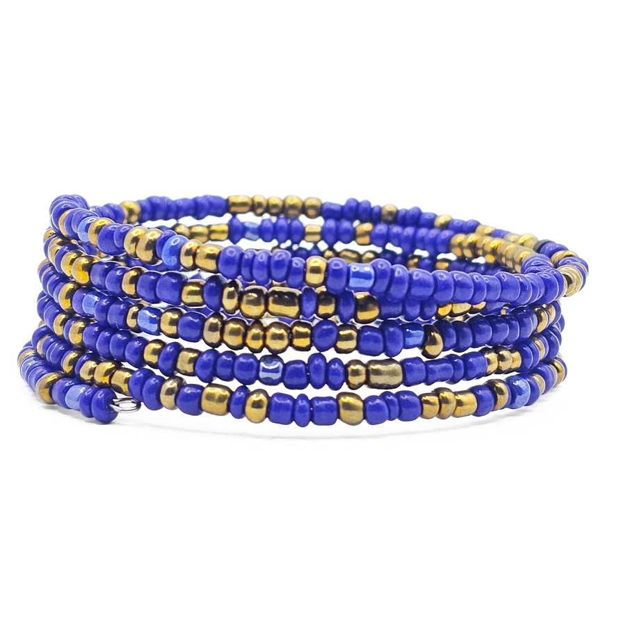 This elegant 5-coil memory wire bracelet features a bold mix of blue and gold seed beads, creating a stacked look in one easy piece. The flexible wrap design fits most wrists comfortably and holds its shape all day.