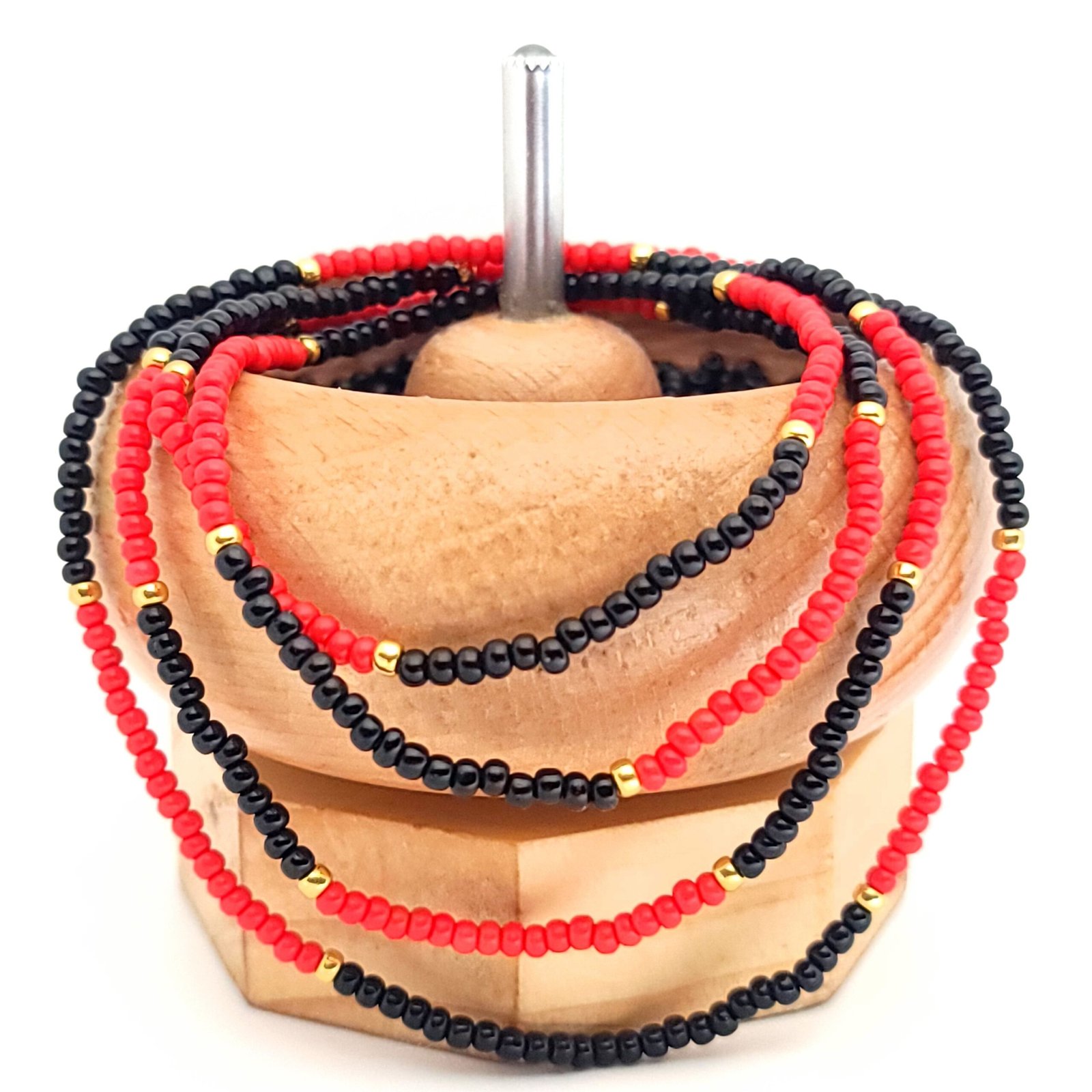 Bold and striking, these red, black, and gold waist beads combine powerful color symbolism with radiant style. Perfect for layering or wearing solo, they bring confidence and presence to your look.